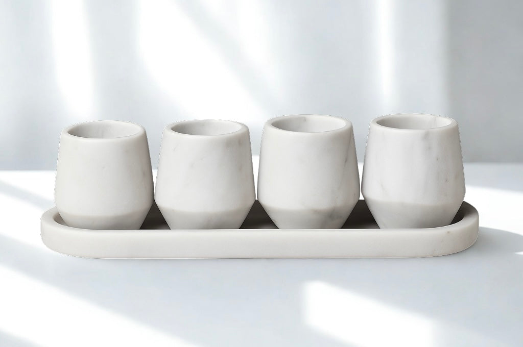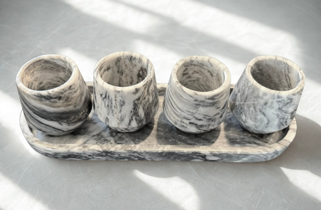 Set de 4 mezcaleros en mármol con plato. Puedes meter los mezcalers al congelador para que al momento de servir se mantenga fría tu bebida.